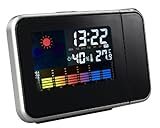 *** Station météo couleur avec projection de l'heure *** Thermomètre, hygromètre, temps, heure, réveil, alarme, fonction snooze, calendrier avec icônes lumineux de couleur indiquant le soleil, peu nuageux, très nuageux, pluie, calendrier perpétuel indiquant jours et semaines. Noir - NEUFStation météo avec projection de l'heure, icônes lumineux de couleur indiquant le soleil, peu nuageux, très nuageux, pluie, calendrier perpétuel indiquant jours et semaines, réveil avec alarme, fonction snooze, heures indiquées par 12 ou 24h, thermomètre en centigrades et en fahrenheit, thermomètre intérieur de 0 à 50°, hygromètre de 20% à 95%, mémoire de maximum et minimum pour le thermomètre et l'hygromètre, indication des températures et de l'hygrométrie durant les 12 dernières heures, lumière pour éclairage nocturne, fonctionne avec adaptateur secteur. Dimensions : 15 x 11 x 2.3 cm